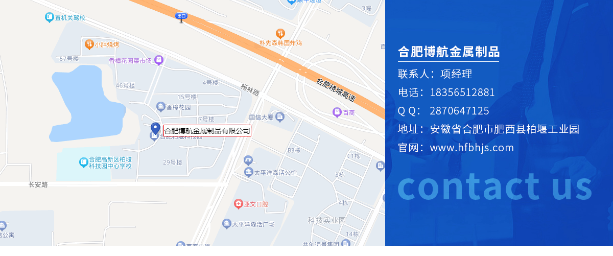- 合肥博航金屬制品有限公司是一家從事金屬制品行業20余年,位于具有國際影響力的創新之都和現代化制造基地中國合肥。公司多年來本著誠信經營,顧客至上的原則,服務于國內各大中小企業,我們的專業化程度、技術服務水平、工程質量以及先進的服務理念得到了客...